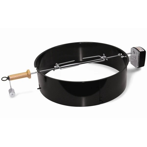 Take your repertoire to a whole new level with a Weber Kettle rotisserie. It comes complete with a rotisserie spit and two forks that can handle a whole chicken or large roast. This BBQ rotisserie is powered by a heavy duty electric motor to ensure smooth turning for even cooking all the way around.